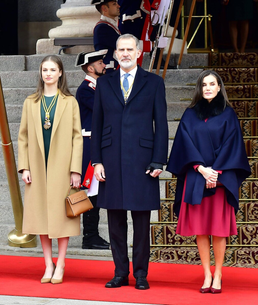 Принцесса Леонор играет всё более важную роль в испанской королевской семье. Она появилась вместе со своими родителями, королём Фелипе и королевой Летицией, на открытии 15-й сессии испанского парламента в Палате представителей. Из-за прохладной погоды всем троим королевским особам приходится кутаться в пальто, а Летиции — в накидку. Летиция выбирает ягодное платье от Carolina Herrera, а Леонор — зелёное платье-футляр.