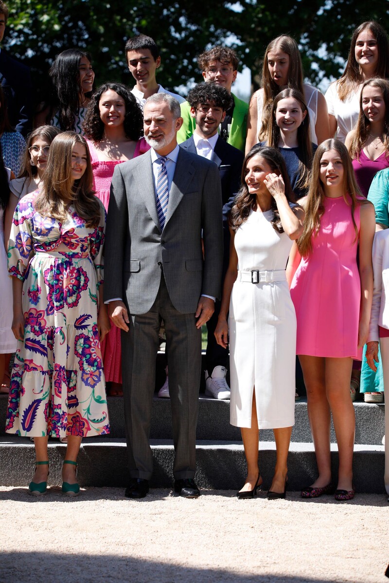 Что касается летнего стиля, дамы испанской королевской семьи явно единодушны: София, её старшая сестра Леонор и её мать, королева Летиция, выбрали белые платья и туфли на танкетке на церемонии награждения в Барселоне. Король Фелипе дополнил синие брюки-чинос рубашкой в сине-белую полоску и пиджаком цвета сизого.
