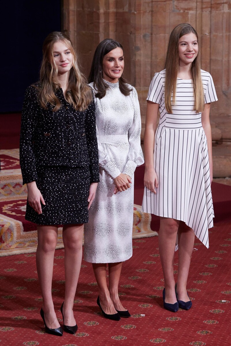 На церемонии вручения премии «Принцесса Астурийская» 2022 года королева Летиция и её две дочери, принцесса Леонор и принцесса София, предстали в особенно красивых и, что самое главное, гармонично подобранных по цвету образах. Королева выбрала белое платье в мелкий горошек от Cherubina. Она дополнила его туфлями-лодочками на плоской подошве от Nina Ricci и изящными серьгами. Дочь Леонор выбрала шикарный твидовый ансамбль от Carolina Herrera и туфли на высоком каблуке того же бренда. Её сестра София была одета в асимметричное платье в чёрную полоску от Hugo Boss. Как и её мать и сестра, она также выбрала чёрные туфли-лодочки.