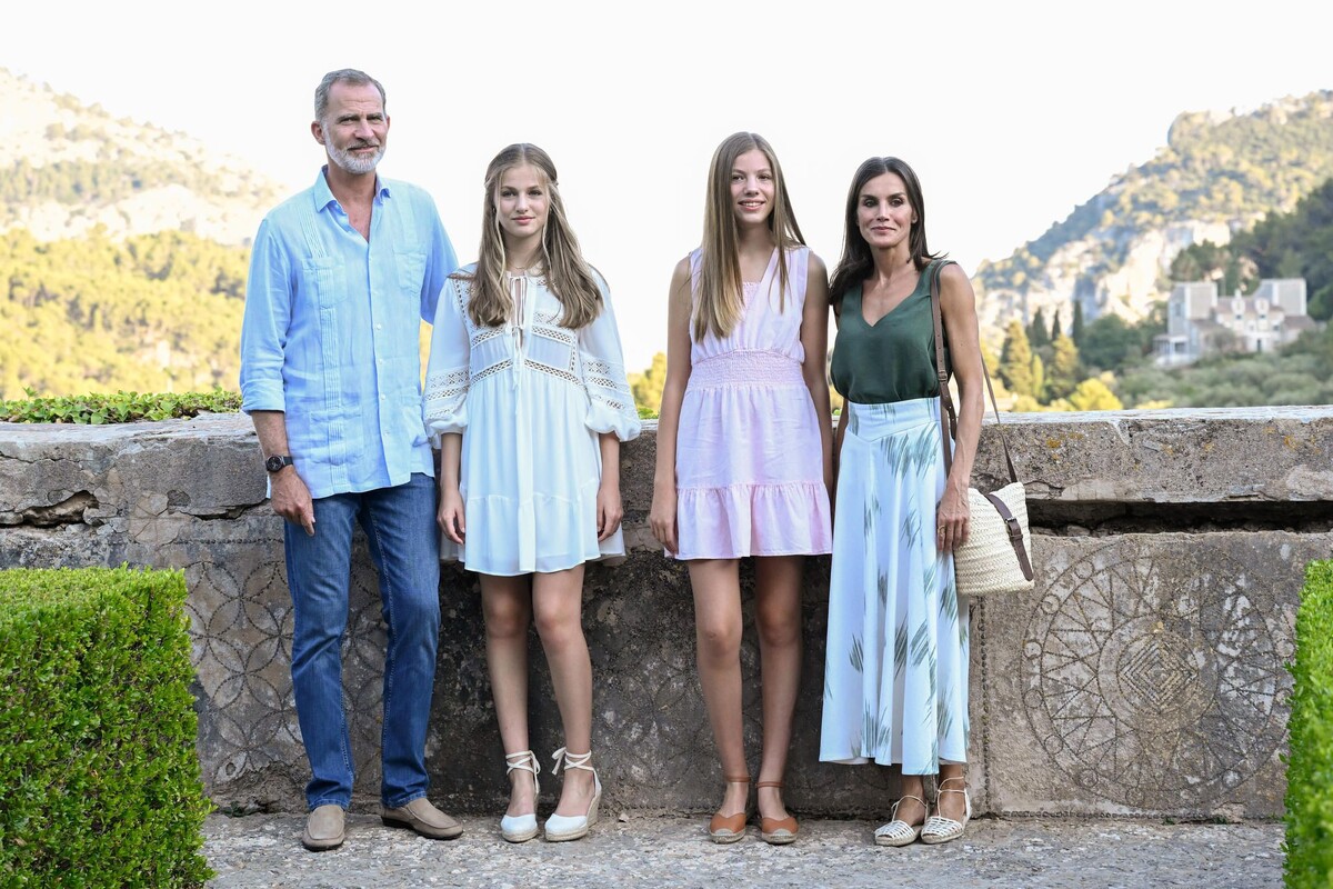 Семейный отдых на Майорке! Король Фелипе и королева Летиция вместе с дочерьми Леонор и Софией посещают бывший монастырь на горе Вальдемосса. После короткой прогулки наряды стали более свободными: принцессы выбрали короткие летние платья с оборками, а Летиция — сочетание длинной юбки и струящегося топа.