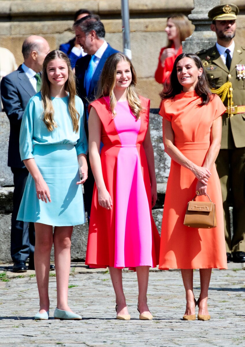 На праздник в честь святого покровителя Испании, апостола Сантьяго, вся королевская семья отправилась в паломнический город Сантьяго-де-Компостела. Там королева Летиция и её дочери поразили всех своим ярким семейным стилем. Принцесса Леонор выглядела невероятно сияющей в своём образе в стиле колор-блок от испанского бренда Cayro. Мама Летиция блистает не менее ярко в платье лососевого цвета от Vogana, а принцесса София вносит сдержанный баланс в стиль королевского трио своим светло-голубым шёлковым нарядом.
