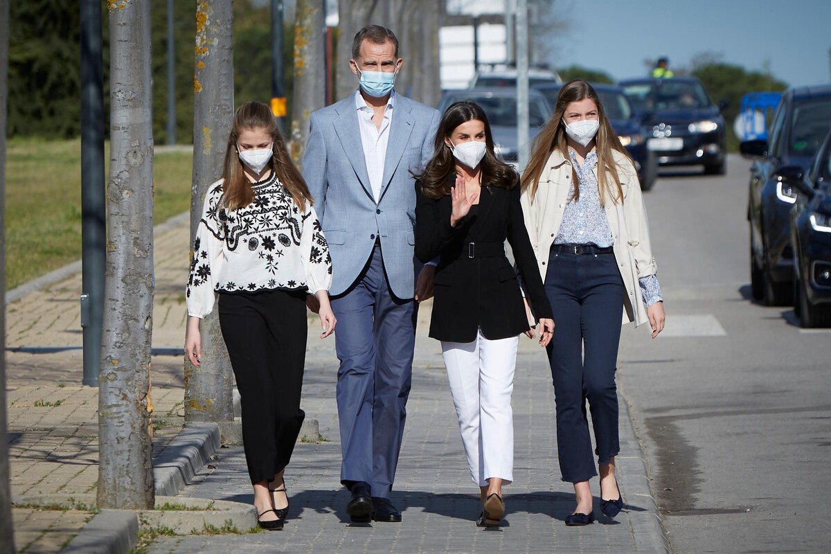Какой важный день для принцессы Леонор! Испанская наследница престола начинает обучение в Военной академии Сарагосы, и в свой последний день в гражданской одежде она появляется в белых джинсах, которые сочетает со свободной синей блузкой и белыми кроссовками. Её сестра София, похоже, оказывает ей необходимую моральную поддержку, выбрав очень похожий наряд. Младшая дочь королевы Летиции и короля Фелипе также выбирает белые джинсы и кроссовки, но дополняет их зелёной блузкой Zara.