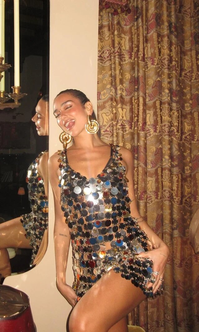 Те, кто ценит дизайн, наверняка знают, что платье Дуа от дизайнерского дома Paco Rabanne, который сделал мерцающие пайетки популярными. Это особенное платье Дуа из коллекции осень-зима 2024 украшено сотнями крупных золотых и серебряных пайеток, скреплённых изящными цепочками, создавая композицию, имитирующую доспехи высокой моды. Благодаря своему крою, платье создаёт ощущение почти прозрачности. Дуа добавила к нему чёрный комплект нижнего белья, чтобы довести эстетику «нижнего белья как верхней одежды».