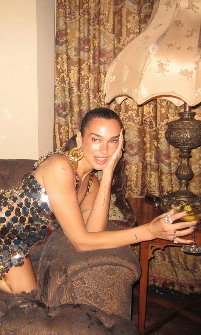Чтобы завершить образ, который она подписала как «никогда не переставая веселиться», Дуа дополнила его парой крупных и эффектных золотых серег, парой черных туфель на каблуках с ремешками и бокалом мартини с двумя оливками.