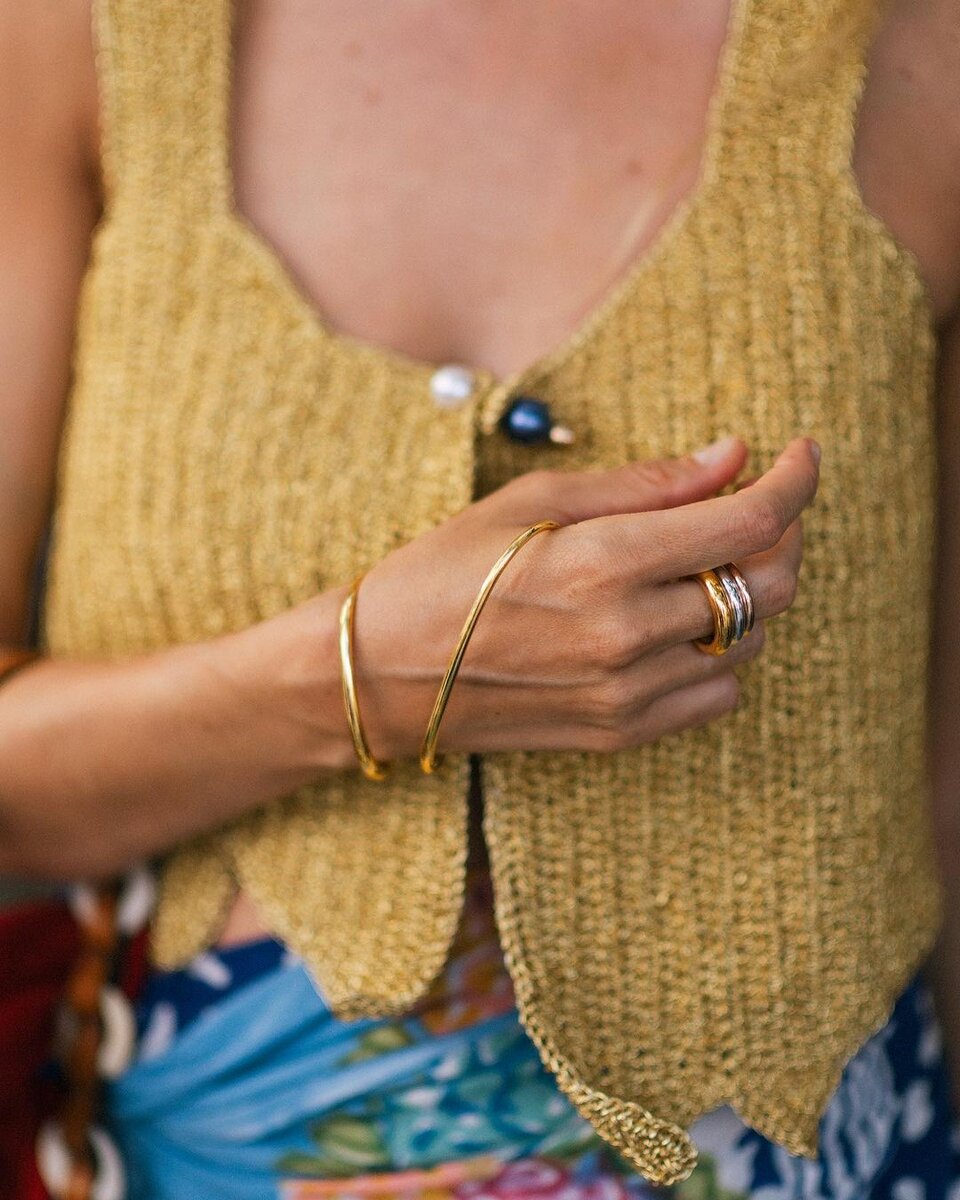 Современные украшения Nada Ghazal и Charlotte Chesnais одновременно обрамляют большой палец и кисть руки, повторяя плавные линии и абстрактные формы, вдохновленные современной скульптурой.