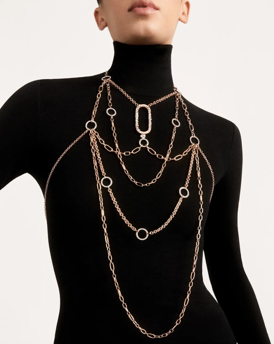 Pomellato дебютировал с цепочками для тела, которые можно носить поверх рубашек или платьев. Messika также предлагает бриллиантовые клипсы для украшения брюк или топов, а перспективный лондонский ювелирный бренд Ouie предлагает украшения для толстовки из серебра, золота или бриллиантов, которые можно регулировать, чтобы они облегали запястье в виде браслета. Но нет ничего более потрясающего, чем гибкий магнитный карман с черными и белыми бриллиантами и ониксом от Boucheron, который можно подобрать к зимнему пальто, вечернему платью или любимым джинсам.