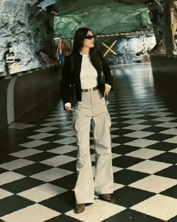 Почему это работает: База (футболка и кроссовки) обеспечивает комфорт. Джинсы-клеш и пальто добавляют элегантности и «звездности». Образ сбалансирован и подходит для большинства ситуаций.