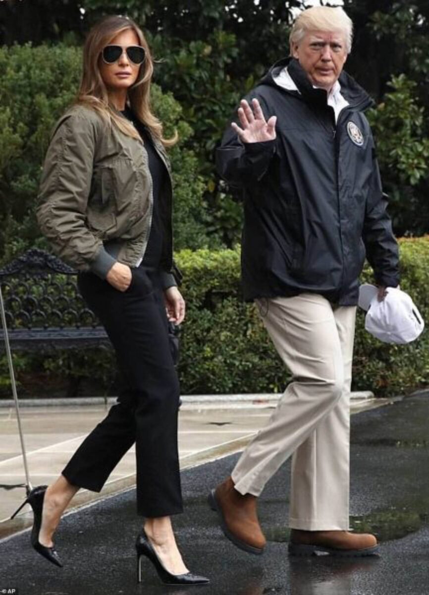 Когда ураган «Харви» обрушился на южный Техас, Дональд и Мелания Трамп покинули Белый дом, чтобы осмотреть ущерб. 29 августа 2017 года они отправились в рейс на борту Air Force One, и Мелании удалось одновременно шокировать и наскучить людям. Скандал начался из-за того, что она надела «ураганные каблуки» – чёрные туфли на шпильке, которые совершенно не подходили для такого случая. Более того, этот наряд посчитали неуместным выбором одежды, который Мелания Трамп никогда не забудет. Но, если не считать высоты каблуков, наряд был довольно безжизненным.