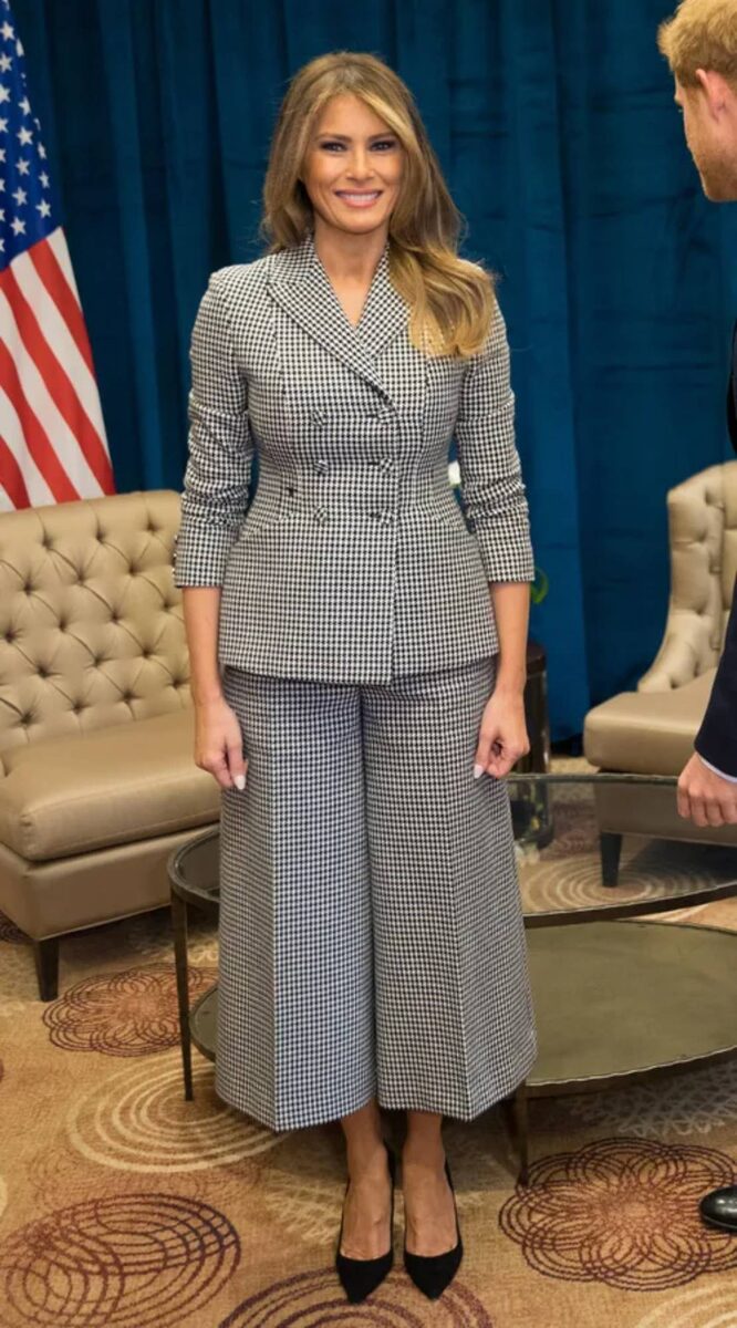 Мелания Трамп не из тех, кто застенчив в вопросах гардероба. Первая леди обычно выбирает цвета драгоценных камней, яркие принты, кейпы, экстравагантные шляпы и броские украшения. Поэтому было удивительно, когда в сентябре 2017 года первая леди отправилась в Торонто в самом скучном наряде, какой только можно себе представить. Мелания смотрела «Игры непокорённых» с принцем Гарри в тусклом брючном костюме в мелкую клетку. От цвета до силуэта в этом образе не было ничего примечательного.
