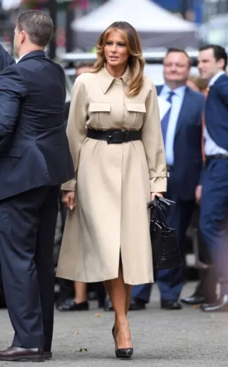 Мелания и Дональд Трамп посетили Соединённое Королевство с государственным визитом в июне 2018 года. Первая леди была одета в кремовое пальто от Celine, застёгнутое до самого горла, что не создавало никакого впечатления. Платье без украшений немного смягчали простой чёрный ремень и каблуки. Хотя её причёска выглядела великолепно, наряд выглядел слишком скучным и консервативным. Она определённо не соответствовала стилю покойной королевы Елизаветы II, которая носила яркие цвета. Создавалось впечатление, что Мелания пыталась скрыться от всеобщего внимания.