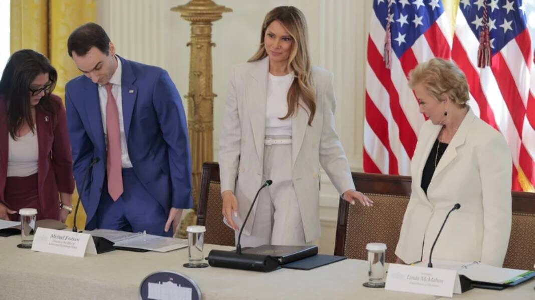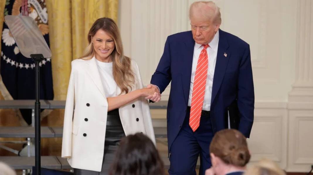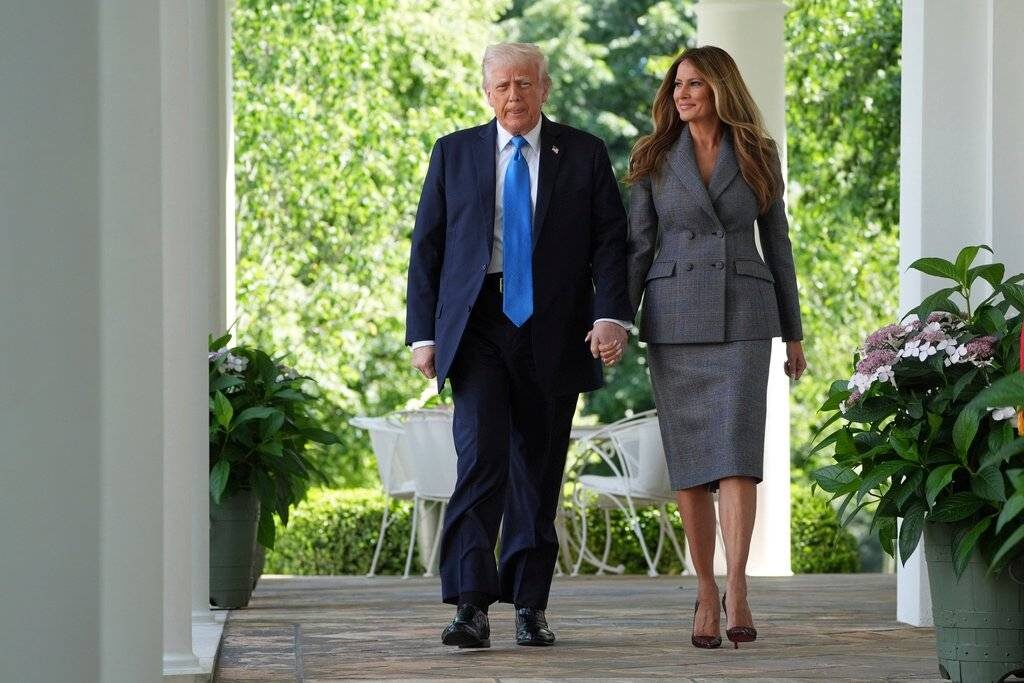 Сколько серых юбочных костюмов у Мелании Трамп? В мае 2025 года они с Дональдом Трампом, держась за руки, направлялись в Розарий Белого дома. Трамп подписывал закон «Take It Down Act» («Запрет на использование интернета»), призванный защитить детей от интернет-угроз. Мелания явно хотела одеться в деловом стиле, потому что на ней был серый двубортный юбочный костюм Prada и чёрные туфли на каблуках. Костюм был хорошо скроен, но общий эффект был невзрачным.