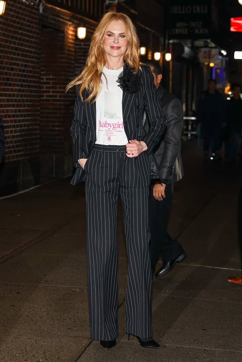 Николь Кидман особенно любит классическое сочетание брюк и пиджака. Именно поэтому в последние годы актриса делится с нами множеством интересных образов, например: полосатый пиджак и брюки, которые Николь Кидман носила во время пресс-тура фильма «Малышка».