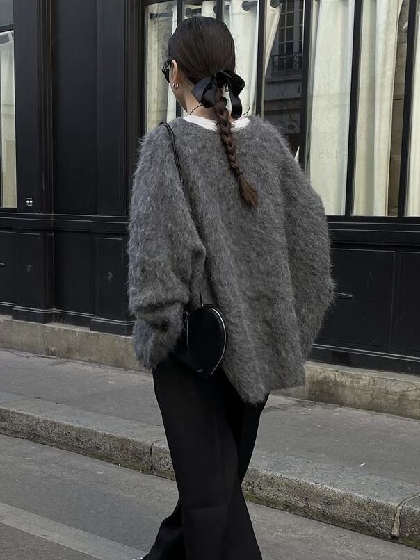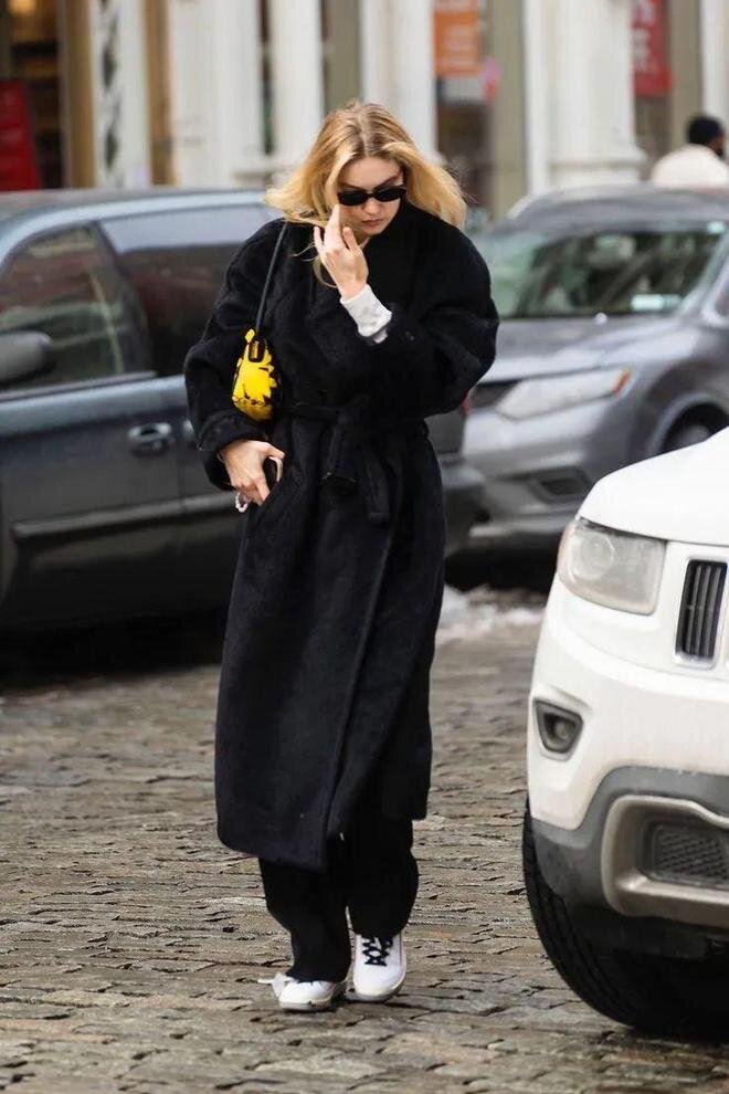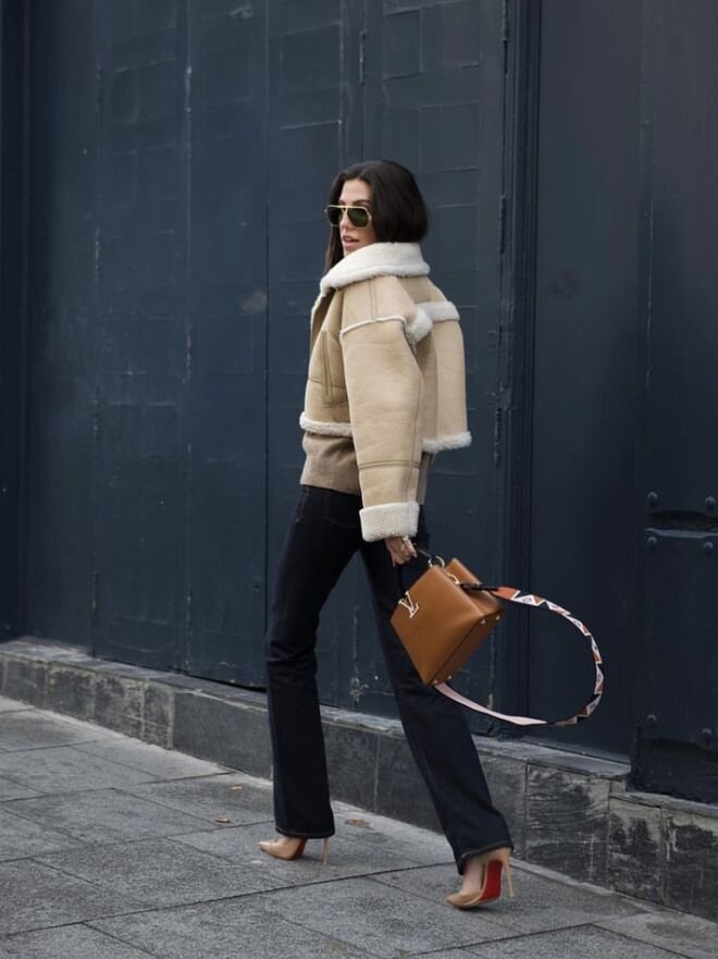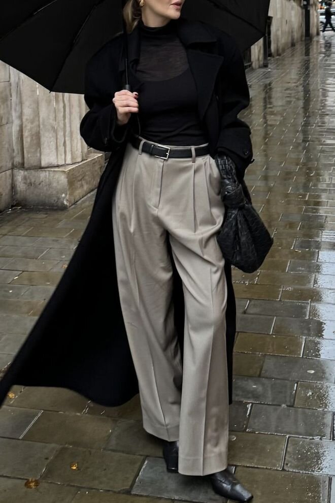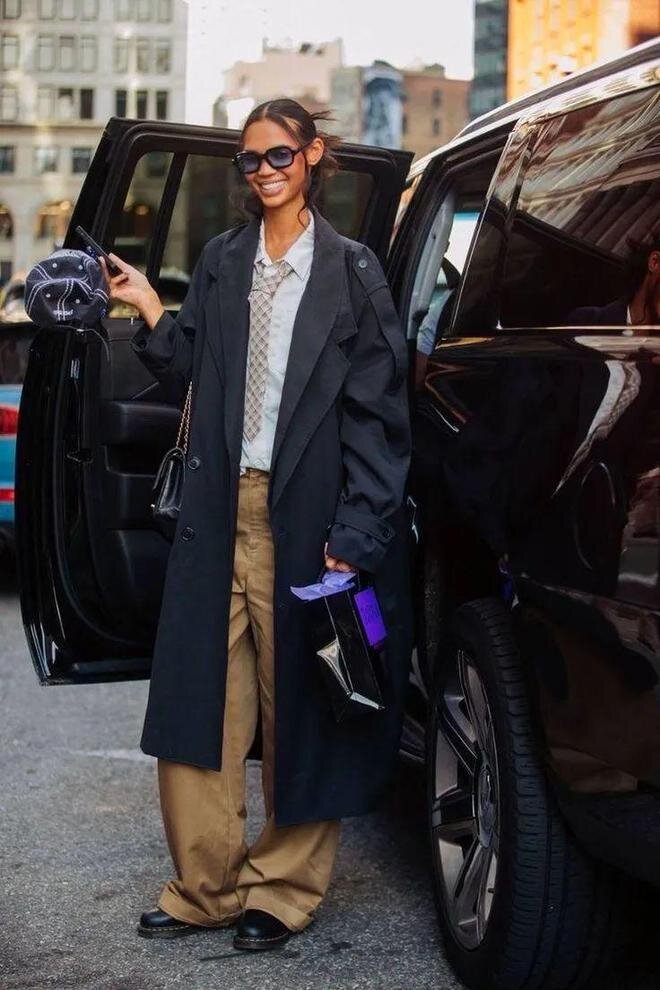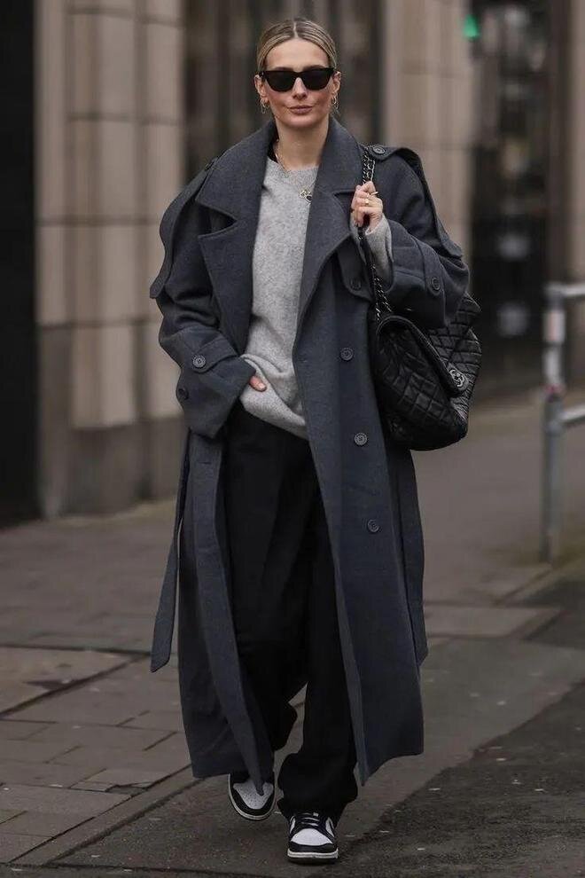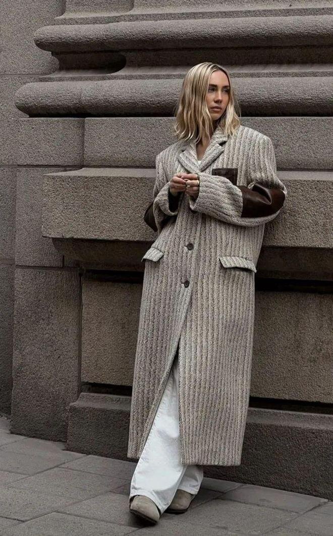 Длинное пальто занимает почти 90% визуальной составляющей всего образа. Таким образом, его текстура определяет общую текстуру всего образа.