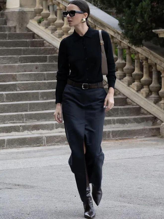 Например, длинная юбка А-силуэта. Сочетайте ее с коротким жакетом или с жакетом с поясом.