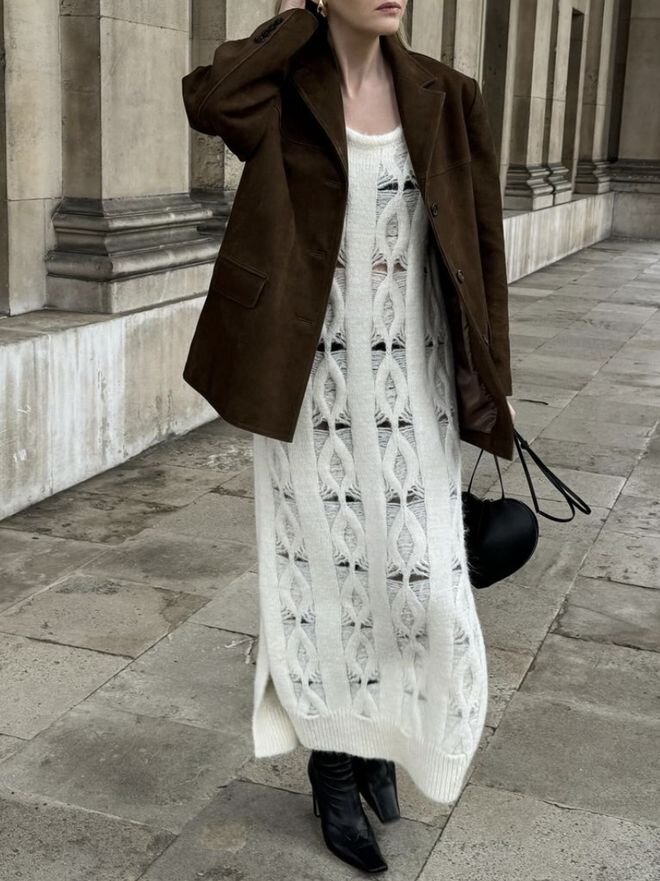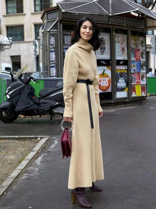- Нельзя, чтобы длинный зимний трикотажный свитер или платье были слишком объемными, иначе будет трудно подобрать к нему подходящий жакет.